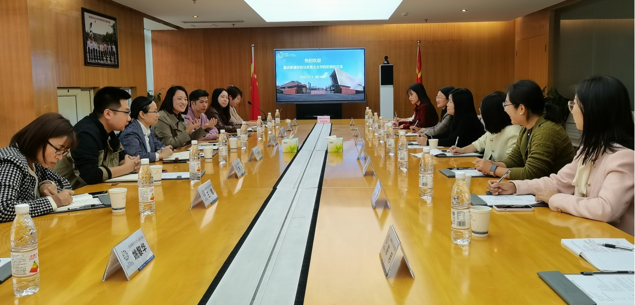 会上,丁灵芝对邓燕一行的来访表示欢迎,并介绍了学校的发展历程、办学特色和马克思主义学院的基本情况,希望通过本次交流,搭建起合作沟通平台,在互学共鉴中推动马克思主义学院高质量发展。陈丹丹从一流课程建设、实践教学开展、理论宣讲和服务社会、特色文化品牌创建、成果的推广与宣传等方面介绍了近年来马克思主义学院取得的重要成果。邓燕对学校的热情接待表示感谢,对学院的建设成果给予了高度评价,并介绍了重庆移通学院“四位一体+双院制”的人才培养模式以及思政课实践基地、“5+1+N”思政课程群建设等情况。双方围绕思政课教学改革、实践教学经验和方法、思政课考核和跨校区管理等方面进行了深入的探讨。