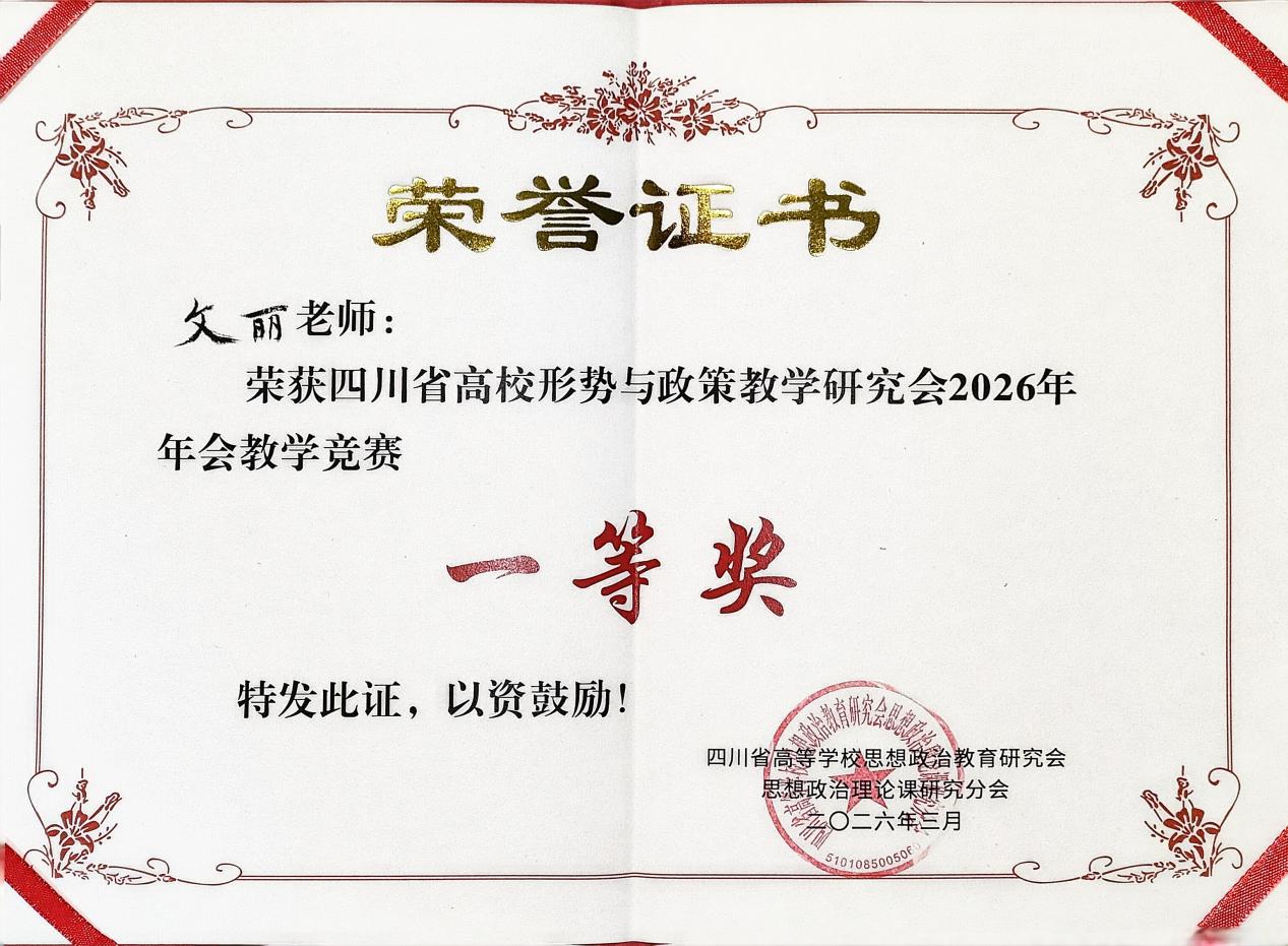 3月28日,四川省高校形势与政策教学研究会2026年年会在川北幼儿师范高等专科学校举行。学院教师文丽荣获课程教学竞赛一等奖。